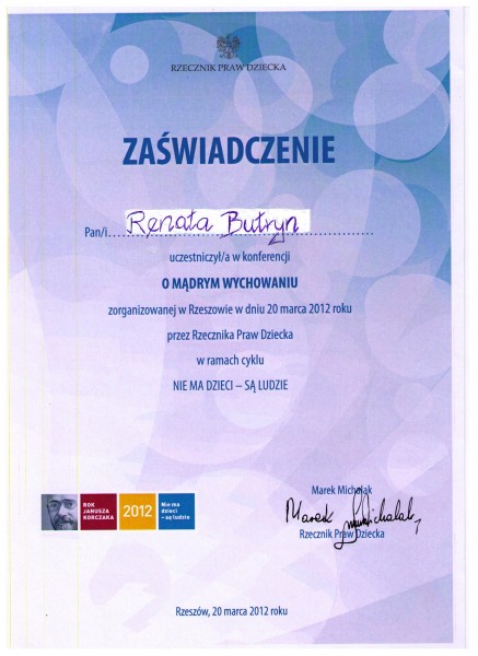 20 marca 2012 roku w Rzeszowie odbyła się siódma konferencja z cyklu „Nie ma dzieci – są ludzie” pt. „O mądrym wychowaniu”, organizowana przez Rzecznika Praw Dziecka Marka Michalaka w ramach obchodów Roku Janusza Korczaka w której udział wzięła Poseł Renata Butryn. W swoim wystąpieniu Marek Michalak mówił o prawach dziecka oraz o idei Roku Janusza Korczaka. Przypomniał, że to właśnie Janusz Korczak przewidział powołanie urzędu Rzecznika Praw Dziecka jako instytucji dbającej o prawa najmłodszych. Zwrócił także uwagę, że przemoc wobec dzieci jest w Polsce zakazana i nie można pozostawać obojętnym wobec jakiejkolwiek formy krzywdzenia – psychicznego czy fizycznego. „Należy podejmować z dzieckiem dialog, umieć nawiązać kontakt. Dzieci mają wiele do powiedzenia o sobie, o nas i o naszym wspólnym dziecięco-dorosłym świecie” – mówił Marek Michalak. Konferencja cieszyła się dużym zainteresowaniem i zgromadziła przeszło 500 uczestników, którzy wypełnili aulę WSPiA Rzeszowie. Wśród nich znaleźli się uczniowie szkół gimnazjalnych i liceów, młodzież z Ochotniczych Hufców Pracy, przedstawiciele policji, straży granicznej oraz kuratorzy sądowi. Uczestnicy konferencji rozmawiali m.in. o prawach dziecka w kontekście praw człowieka, wychowaniu do wolności i odpowiedzialności oraz o przygotowaniu kadry urzędników i funkcjonariuszy do pracy